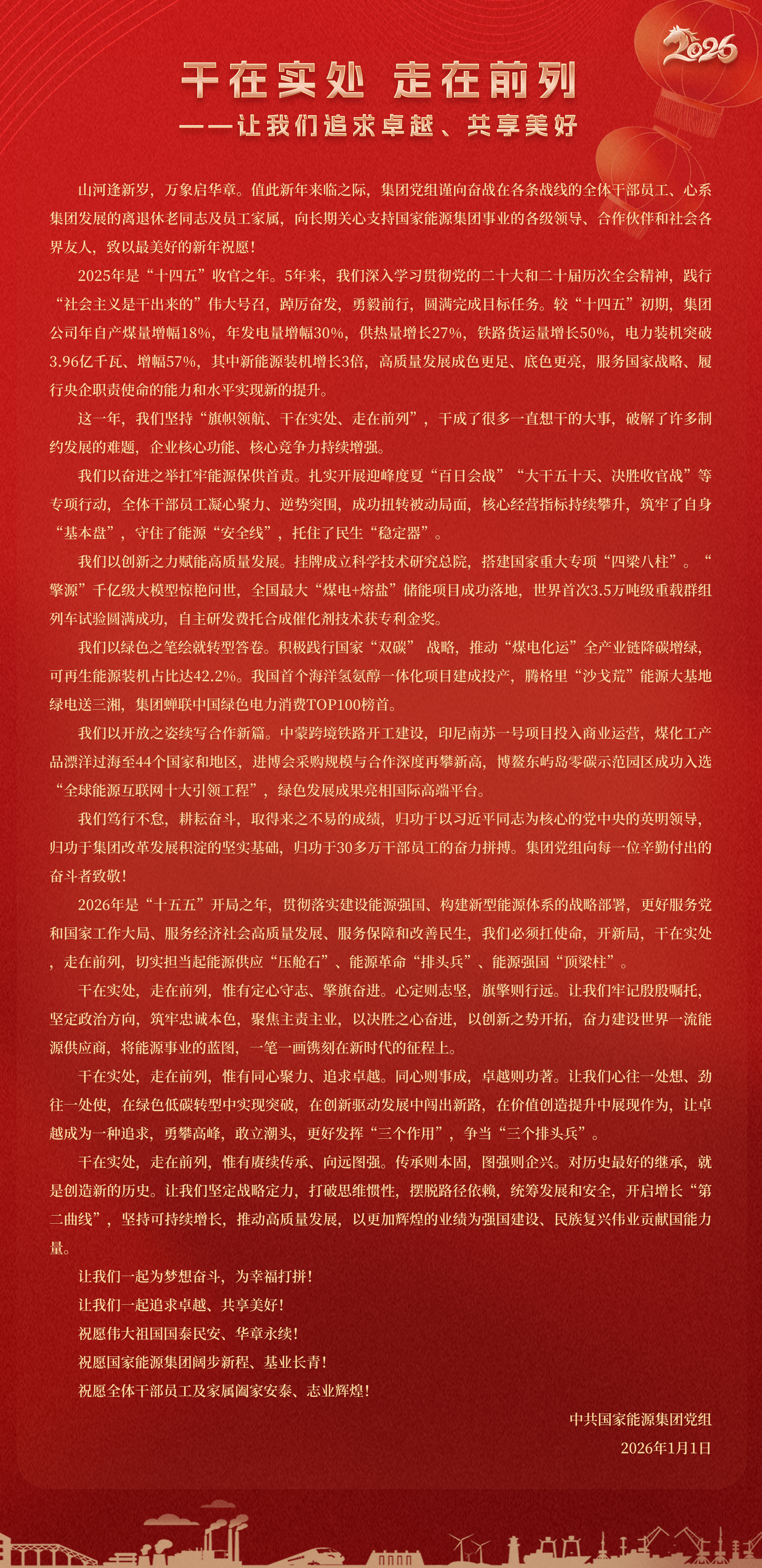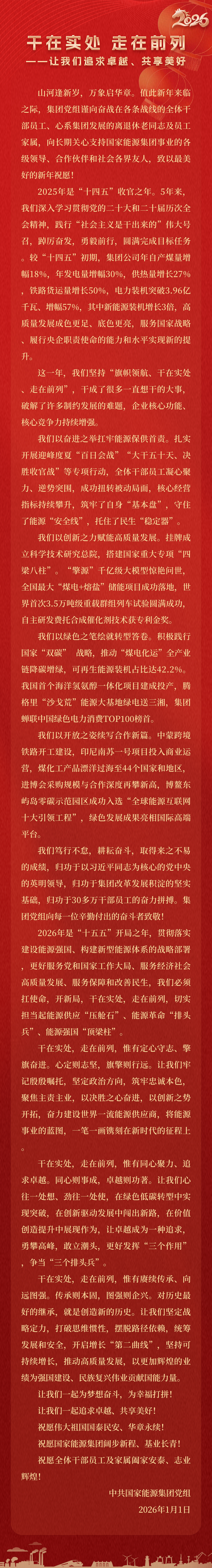 國家能源集團胸懷“國之大者”,增產(chǎn)增供、穩(wěn)價穩(wěn)市,積極服從服務國家戰(zhàn)略、保障國家能源安全、助力國民經(jīng)濟穩(wěn)增長,推動煤炭安全綠色智能、煤電清潔高效穩(wěn)定、現(xiàn)代煤化工高端多元低碳、運輸物流協(xié)同一體、新能源多元創(chuàng)新規(guī)模化發(fā)展,全力擔當能源強國頂梁柱,能源供應壓艙石,能源革命排頭兵。